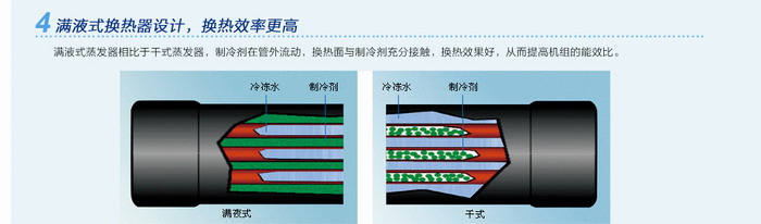滿液式蒸發(fā)器相比于干式蒸發(fā)器,制冷劑在管外流動,換熱面與制冷劑充分接觸,換熱效果好,從而提高機(jī)組的能效比。