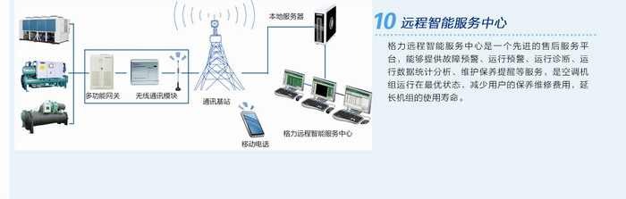 格力遠(yuǎn)程智能服務(wù)中心是一個先進(jìn)的售后服務(wù)平臺,能夠提供故障預(yù)警、運(yùn)行預(yù)警、運(yùn)行診斷、運(yùn)行數(shù)據(jù)統(tǒng)計分析、維護(hù)保養(yǎng)提醒等服務(wù),是空調(diào)機(jī)組運(yùn)行在最優(yōu)狀態(tài),減少用戶的保養(yǎng)維修費(fèi)用,延長機(jī)組的使用壽命。