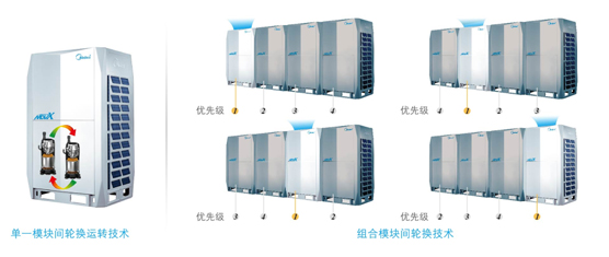 系統根據系統負荷情況,輪換設置優先開啟的室外機模塊的壓縮機順序,平衡分配每臺室外機模塊的運行時間,大大提高了機組的可靠性和使用壽命。